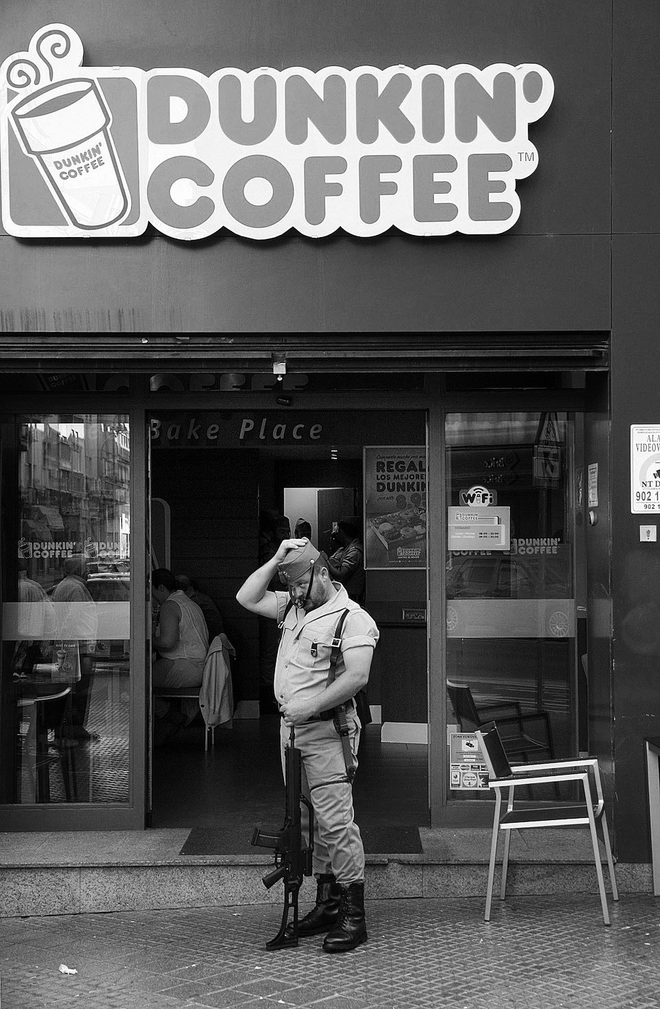 Caballero legionario se coloca el chapiri delante de un Dunkin Coffee, Semana Santa malagueña 2015/Chapiri knight legionary standing in front of a Dunkin Coffee, Malaga Easter 2015