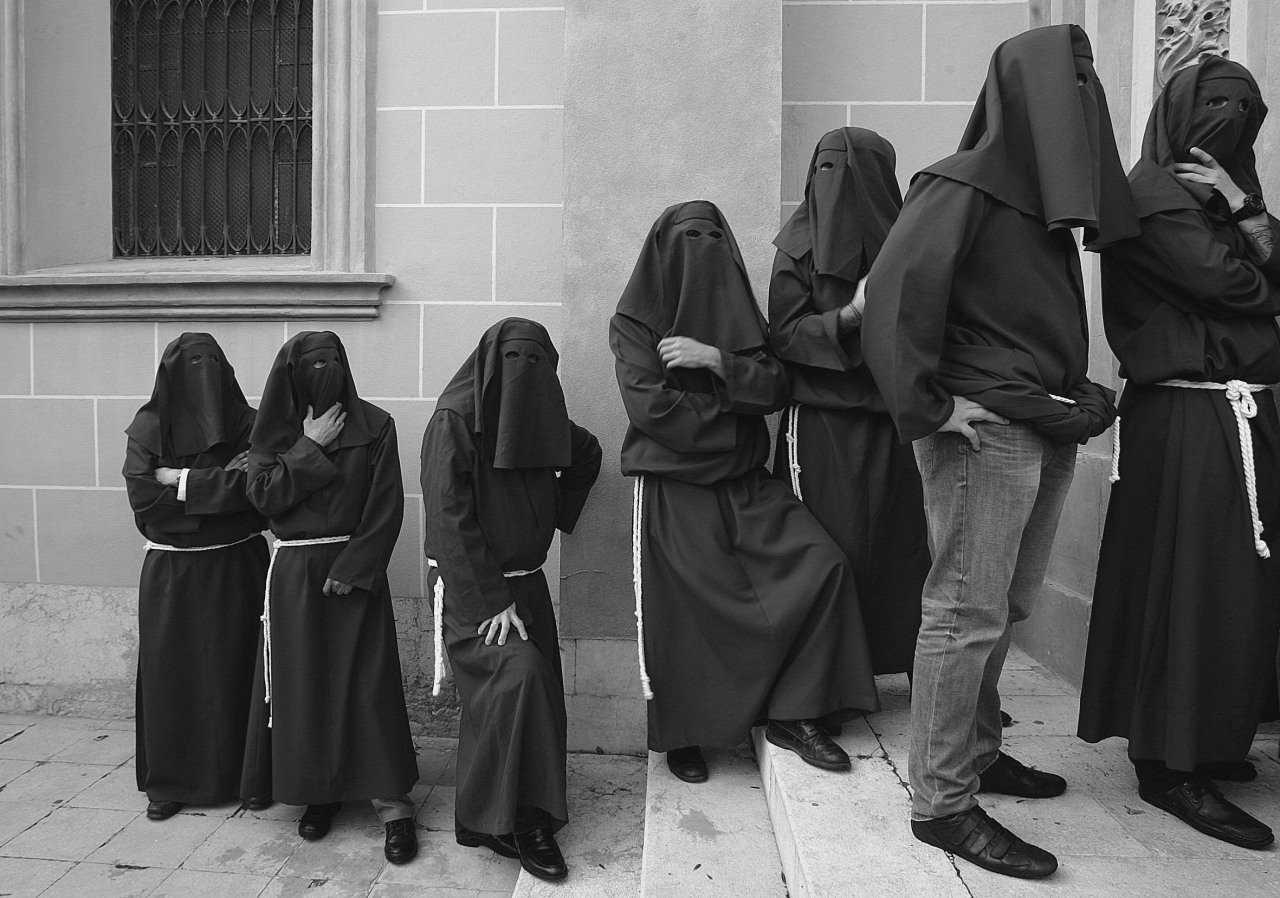 Hombres de trono esperan la salida de la cofradía de la Salud/Men throne wait the departure of the brotherhood of Health.